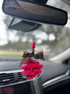 Add sass and style to your ride with this rearview mirror charm featuring pink and leopard beads paired with the bold phrase “But Did You Die.” Fun and eye-catching, it’s the perfect accessory for anyone who loves a little humor and flair on the road.