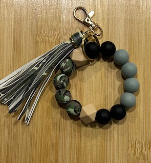 Stay on trend with this camo beaded wristlet, designed with earthy tones and rugged style. Perfect for keeping your keys and essentials close at hand, it blends practicality with a bold, outdoorsy look. A must-have accessory for everyday wear or adventure days.